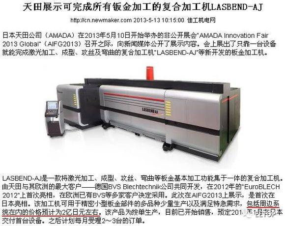 日本amada在2000年推出的畅销欧洲的astro-540 interpro机型基础上开发出了世界首台将激光溶接-成型-攻丝-折弯4项钣金制造工序集成于一体的复合钣金加工机LASBEND-AJ;当选德国权威机械技术杂志maschinemarket评出的2013年度最佳革新技术奖。并已从欧洲和日本获得数台订单,第一台设备将纳入德国钣金部件制造商BVS GmbH