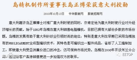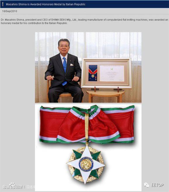 岛精机出品的电脑横机在崇尚高端时装的欧洲佬眼里被称为针织机械界的“劳斯莱斯” 。董事长岛正博先生因在纺织设备领域对意大利时装界的恭献被授与意大利国家级荣誉勋章 。