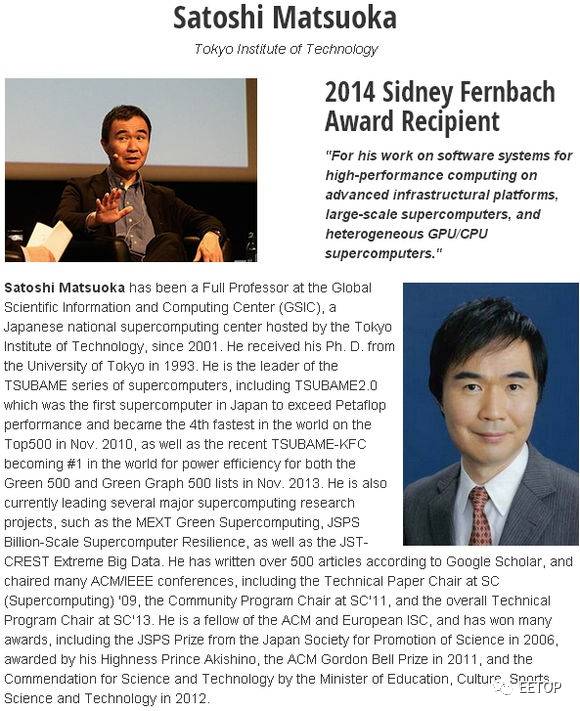 cpu/gpu异构式超算系统的提倡者兼此平台程序软件的先驱开发者,超级计算机界最高峰学术赏sidney fernbach award的新科得主——东京工业大学全球科学信息计算中心prof.satoshi matsuoka;随着后续软体资源的快速配套和并行集群计算技术的加速发展,cpu/gpu异构式超算已经成为整个hpc界的事实标准体系,从最早的tsubame1.2到连续green500测试头名的tsubame-kfc,目前全球几乎所有高性能超算系统都是此架构的支持者,matsuoka博士也因此获得了象征超级计算机领域个人最高荣誉的sidney fernbach award