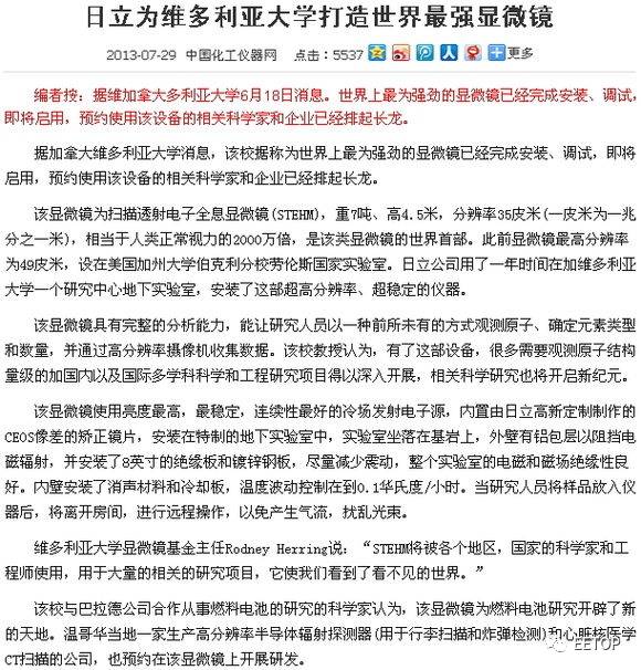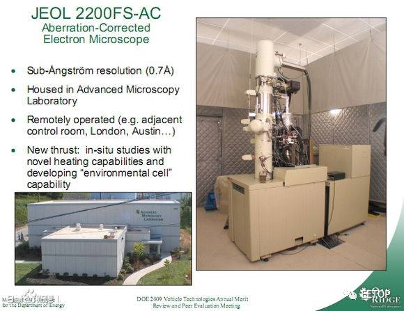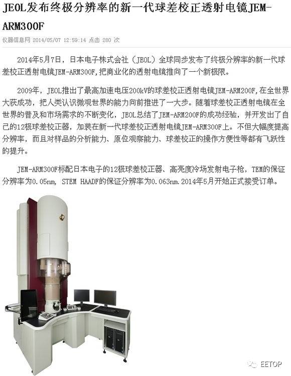 C、探索微观世界的“队长”——电子显微镜,本人有幸去过两次中科院物理所,那里最顶级的场发射透射电镜按rmb计价可达3000万/台,豪无疑问能否自主设计建造高分辩的透射/扫描电镜是对一国电子工业水准的重要考核环节之一 目前全球高端电子显微镜主要有两大品牌:JEOL和FEI,前者是日系后者是美系,这里说下日系的 美国能源部橡树岭国家实验室引进具有原子级分辨率的JEOL-2200FS像差校正场发射透射电镜提升精密材料学的研究水准,并建立全球实验室以让境外如伦敦帝国理工的科学家通过高带宽低延迟网络远程操控JEOL的此电镜