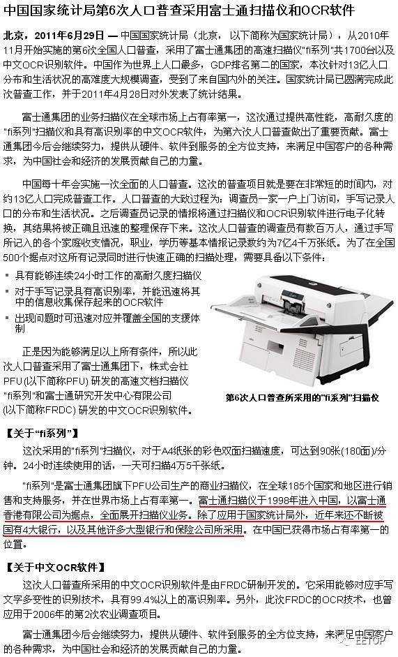 日本富士通的天下。 全球商业智能文档影像解决方案一哥,表单印刷-识别-电子化合体技术的发明者——富士通pfu;富士通pfu利用自己世界最高市场份额的商用扫描仪和独立开发的光学字符识别软件(ocr)帮助中国国家统计局高效准确的完成了世界最大规模人口普查 。