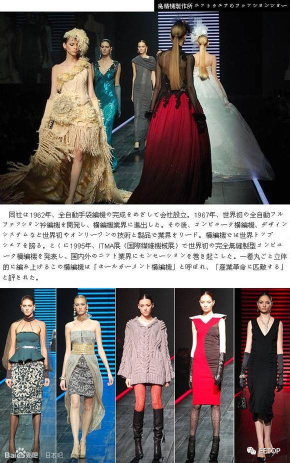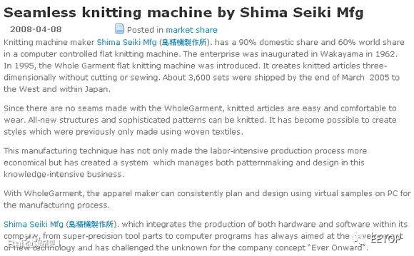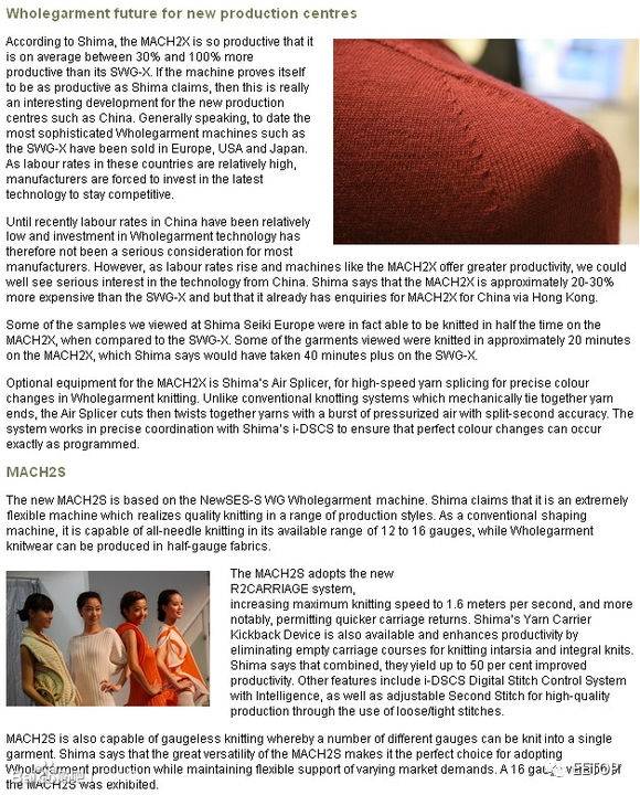 说几个有趣的东西 ,但对精密度,稳定性要求非常高的设备。一家非常欣赏的中小企业——来自日本和歌山市的岛精机制作所,世界最快速全成型电脑横机记录保持者,同时还握有此领域全球6成份额;电脑横机与工业缝纫机并称为纺织业界的两大母机,工业缝纫机的一哥也来自日本,混服装界的都应该知道,这里不多说。。