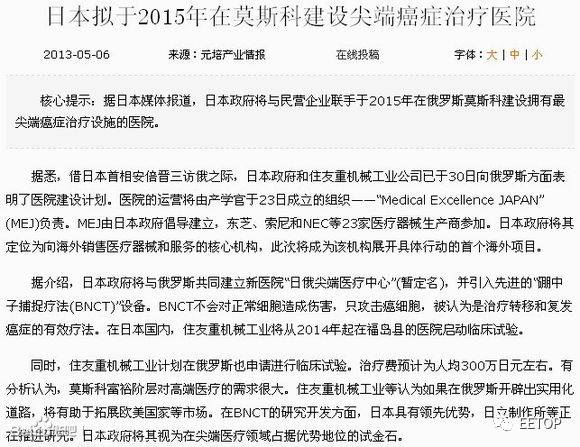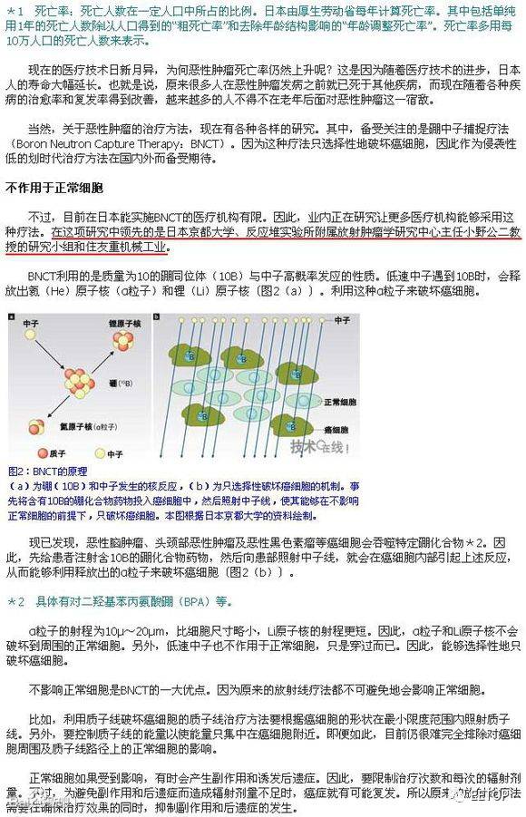 世界首个不依靠科研反应堆,成功商业化为医院专用的硼中子捕捉疗法(BNCT)设备——住友重机械 京都大学;BNCT是次世代最被关注的不需上手术台的癌治疗手段之一,日本产学界合作,率先于全球开发并实用化使用回旋加速器的BNCT设备可保证日本长期在尖端医疗器械领域位于不败之地