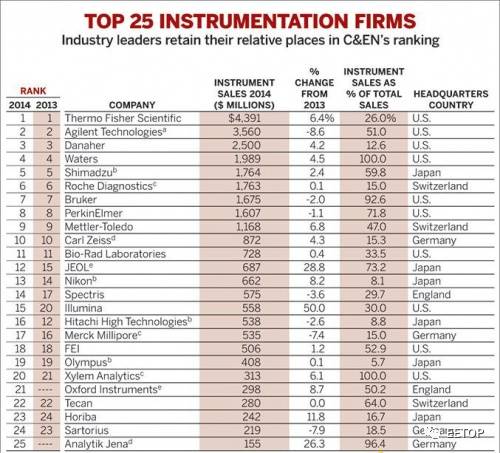 2015全球顶尖精密仪器top 25 美日德基本垄断 其中美国10家,日本6家,德国4家,英国2家 。仪器指:医疗,科研设备等,比如:显微镜,光谱仪,引力波探测器, 拉曼成像仪,测量仪等等。美日都是诺贝尔奖大国,日本从2000年开始基本每年一个诺贝尔奖,其中之一就是离不开其高端仪器的制造,使用。