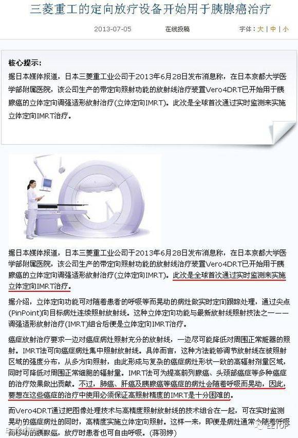 世界首台带立体定向功能的适形调强放疗设备并用于胰腺癌治疗——三菱重工
