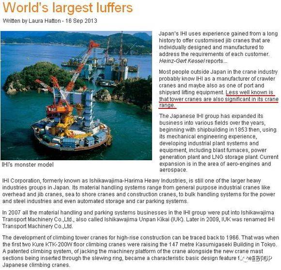 历史上最大(8100tm)的拥有量产记录的动臂塔吊(动臂自升式起重机)——IHI运搬机械,在此之前IHI曾将起重力矩为5600tm的“前世界第一大”塔式起重机用于明石海峡大桥的主塔施工 动臂塔吊相比水平臂塔吊虽然造价昂贵 起升变幅速度慢,但由于具有臂架在作业时变幅面积可控 不会对他物造成干扰 平衡稳定性高 起重量大适合吊装钢筋混凝土等重型构件的优势,成为当今大规模建筑现场的主流母机