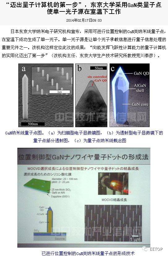 东京大学在世界首次采用III族氮化物普及材料(GaN-氮化镓)作为量子点单光子源成功生成可于常温下操作的单一光子,迈出了量子计算的第一步。