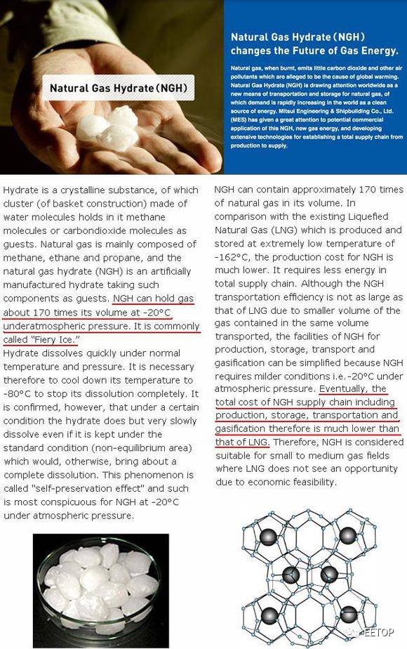 除甲烷水合物外另一种可燃冰——天然气水合物(NGH),三井造船在全球首次成功完成从微丸制备-储存到运输-再气化的一整套“陆上天然气水合物运送流程”的研究,并建造出世界首艘NGH专用运输船;天然气水合物做为一种前景广阔的新能源后选物,一旦大规模应用则将激发新油田开采,有望极大减少火电厂对LNG的依赖