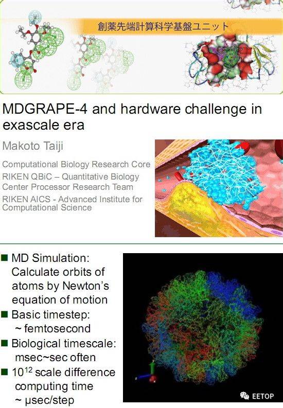 世界最快生命科学专用超级计算机已由riken完成开发,已经于2014年第一季度在riken位于神户市的生命系统研究中心正式投入运转;这台超算搭载了riken与日立合作最新研发的grape系列第4代分子动力学模拟专用计算芯片(加速器),由于专门针对创药领域的蛋白质分子 经典粒子动态解释,所以此超算不能运行top500通用超算的linpack测试基准程序,但是如果只考虑运算性能的话它的计算速度将达到京超算的近百倍,并毫无疑问从ibm手中夺回最高性能创药专用超算的头把交椅