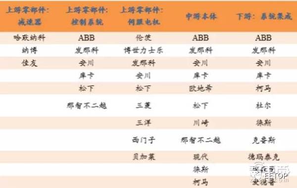 一线厂家包括:发那科(Fanuc 日本)、安川(Yaskawa 日本)、ABB(瑞士)、库卡(KUKA 德国)。 二线厂商包括Comau(意大利)、OTC(Daihen旗下 日本)、川崎(Kawasaki 日本)、那智不二越(Nachi-Fujikoshi 日本)、松下(Panasonic 日本)等等