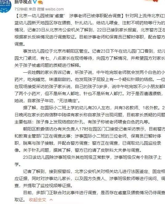 针对网上流传北京红黄蓝幼儿园新天地园区存在猥亵、针扎幼儿,给幼儿喂食、注射不明药物等行为的情况,北京市公安机关给新华社记着的答复是:22日已接到家长报案,北京警方正在根据家长反映情况进行调查取证。目前涉事老师和保育员已暂时停职,配合警方调查。