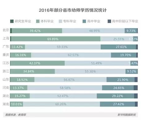 上图中能看出,2016年上海的本科学历的幼师占比最高,达到将近70%,而且已经完全不含高中阶段以下毕业生。可是,北京仍有9.73%的高中毕业及以下学历的幼师。