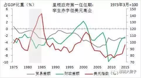 1981年,里根开始大幅减税,导致财政赤字短期扩张,进一步引发美国国债利率上升,市场利率进一步推高,美元持续走强,需求被别的国家抢走,结果就是,高利率抑制了市场投资,抵消了减税对投资的刺激作用。
