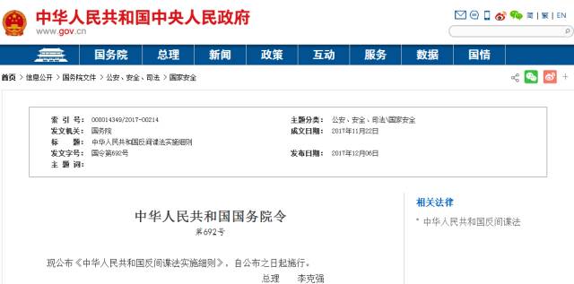 据悉,此次反间谍法实施细则,是2014年《中华人民共和国反间谍法》实施以来,所进行的首次大规模内容增订!