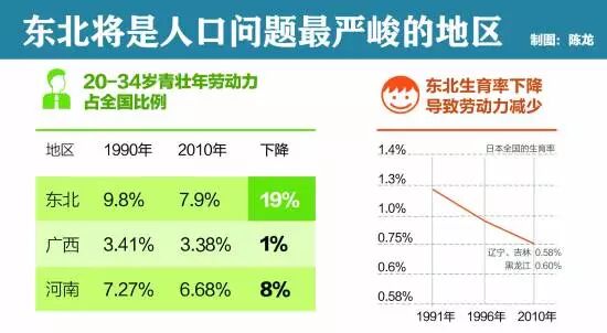 如今的东北,便是10年后的中国。东北人口加速减少并不是区域问题,而是为整个中国拉响了警报。2012年中国15岁至59岁的劳动年龄人口为9.37亿,首次下降0.6个百分点,预示着我国人口红利时代即将结束,“人口负债”时代悄然来临。有数据表明,东北人口流出地主要是北京、天津、河北,而河北等省人口流出地是北京、上海、天津等大城市,以及经济发达的东南沿海地区。报告显示,中国已成为世界第一大海外移民数量国,仅广东移民人数就占全国一半,东南沿海地区正是移民主力,不论是打工还是移民都非常方便,工作选择完全不局限在国内。在全国生育率不断下降,老龄化不断严重的现实下,争夺优秀人才和劳动年龄人口已经上升到国家战略层面,而且形势十分严峻。