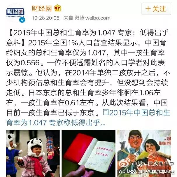2015年公布的《中国统计年鉴2016》中对全国1%人口抽样调查显示,中国2015年的总和生育率仅为1.05,比世界正常人口更替生育率2.1整整低一倍。