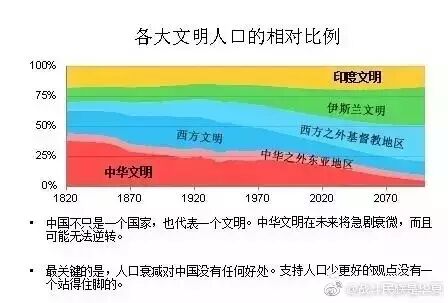 中国在历史上并非仅仅是一个国家,而是一个文明,是东方文明的代表!作为一个文明,中国现在并无人口优势。相对较低的生育率已经让中华文明占世界人口的比例在过去200年中不断萎缩,从四个文明中人口最多降为与印度文明相似的末位,并将很快被印度文明大幅超过。即使在2015年全面放开生育,但如果无法显著提升生育率,中国占世界人口的比例将急剧萎缩,到本世纪末将变得微不足道,中国的分量将一落千丈,中华文明将彻底衰微。