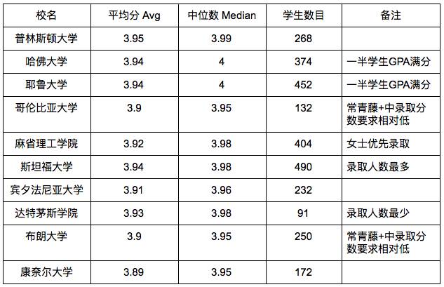 所有这些常青藤+的大学,中位数都在3.95以上。3.95是什么概念呢?简单说,就是高中每20门课程,如果A是4.0, B是3.0的话,学生只能有1门是B,19门是A,那么平均的GPA是3.95。