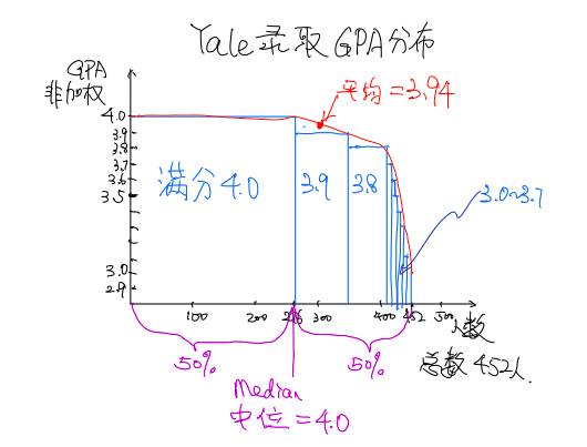 我们从耶鲁的历史数据来看,招收了452个人,中位数4.0,平均分3.94。我们看看下面这张图,可以更清楚说明这个概念。
