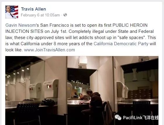 共和党反对吸毒,比如川普的建墙,除了阻止非法移民以外,另一个重要目的是堵住毒品走私通道。各州大麻合法化的过程中,基本上也是共和党反对,民主党支持。加州的州长候选人Travis Allen(共和党),不久前发帖抨击旧金山的做法: