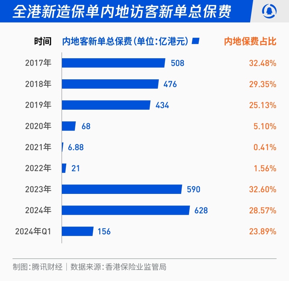 尽管目前香港保监局因正全面检视非本地保单持有人投保资料收集准则,暂未发布内地访客的详细投保数据,但2024年临时统计数据显示,内地访客新造保单保费为628亿港元,同比增长6.5%,占个人业务总新单保费的28.6%;而2024年一季度内地访客保费为156亿港元,在全港新造保单保费中占比23.89%,以此推算,2025年一季度内地访客新造保单保费可能超过200亿港元,成为推动香港保险市场增长的重要力量。