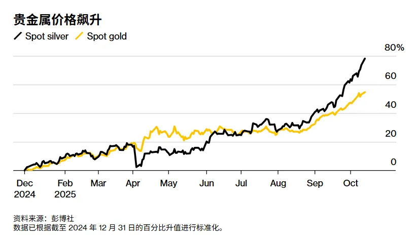 白银现货价格也突破45年来新高。上一次的纪录,还是1980年亨特兄弟试图操纵市场达成的。而且上涨还将继续——伦敦白银库存告急,目前有1500万到3000万盎司白银用运送金条的昂贵方式从纽约运往伦敦,以提供流动性。
