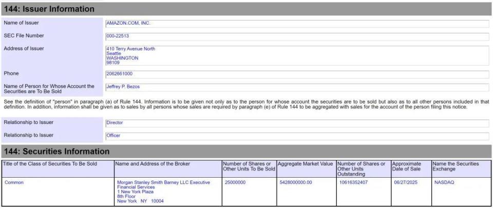 据亚马逊递交给美国SEC的文件显示,贝佐斯也在2025年6月27日减持2500万股,套现54.28亿美元。