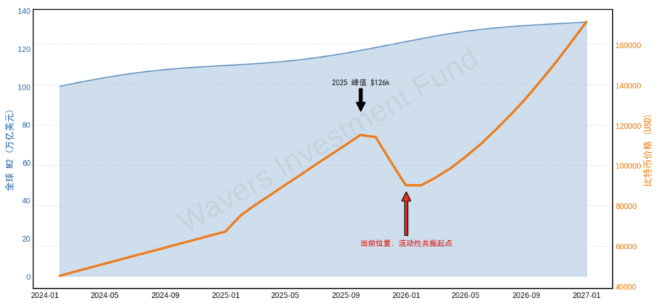 历史数据诚实地告诉我们,比特币的价格走势与全球 M2 的增长高度正相关。2025 年底,尽管币价在跌,但全球 M2 总量却在悄然突破 130 万亿美元的历史新高。