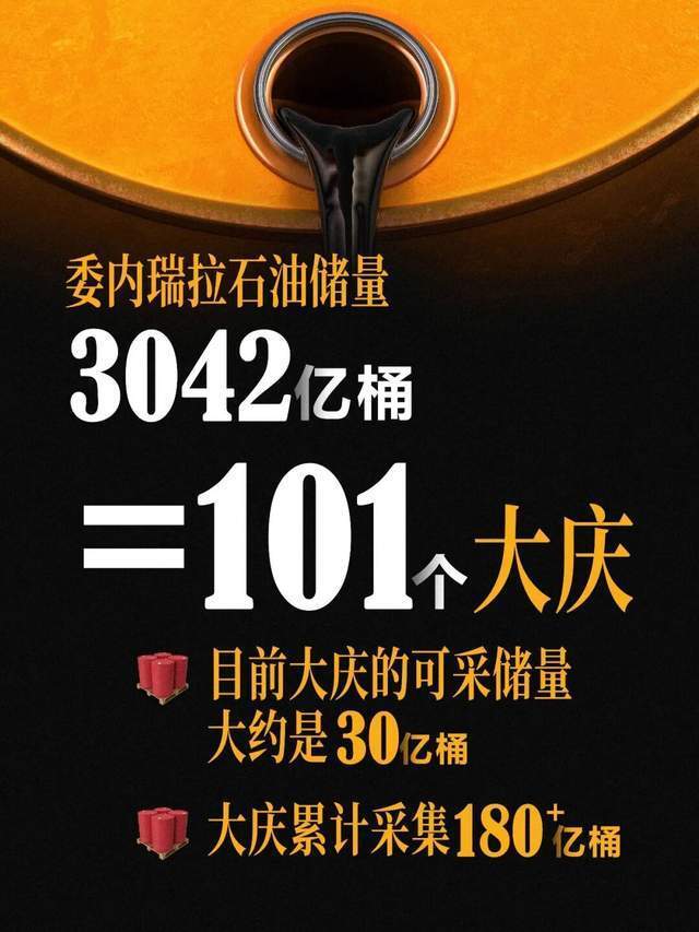 如果拿我们的头牌大庆油田来比一比,目前大庆的可采储量大约是30亿桶。那么一个委内瑞拉,就相当于101个大庆。