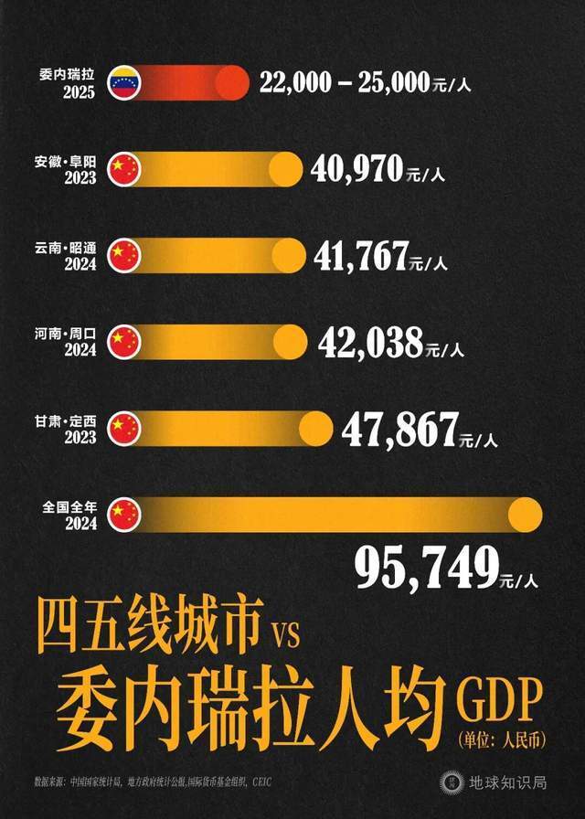 近5年内:委内瑞拉的人均GDP一直在3000~4000美元之间晃荡。放在中国国内,也明显低于阜阳、昭通、周口、定西。