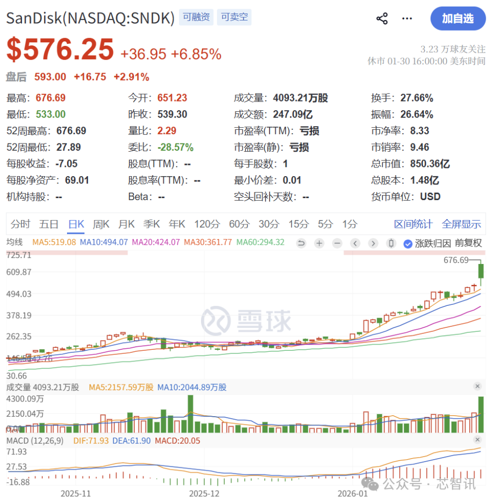受益于人工智能(AI)对于存储需求的爆炸性增长,Sandisk该季度的营收、净利润、每股收益以及下一季的业绩指引均大幅超出市场分析师的预期,推动SanDisk 股价在1月30日的美股交易中一度暴涨近26%,但收盘涨幅收窄至6.85%,收于576.25美元/股,但其股价仍比去年低位时(约27.89美元/股)上涨了1966%以上,市值接近853亿美元。外资投行Jefferies和高盛均将SanDisk股票目标价大幅上调到了700美元。