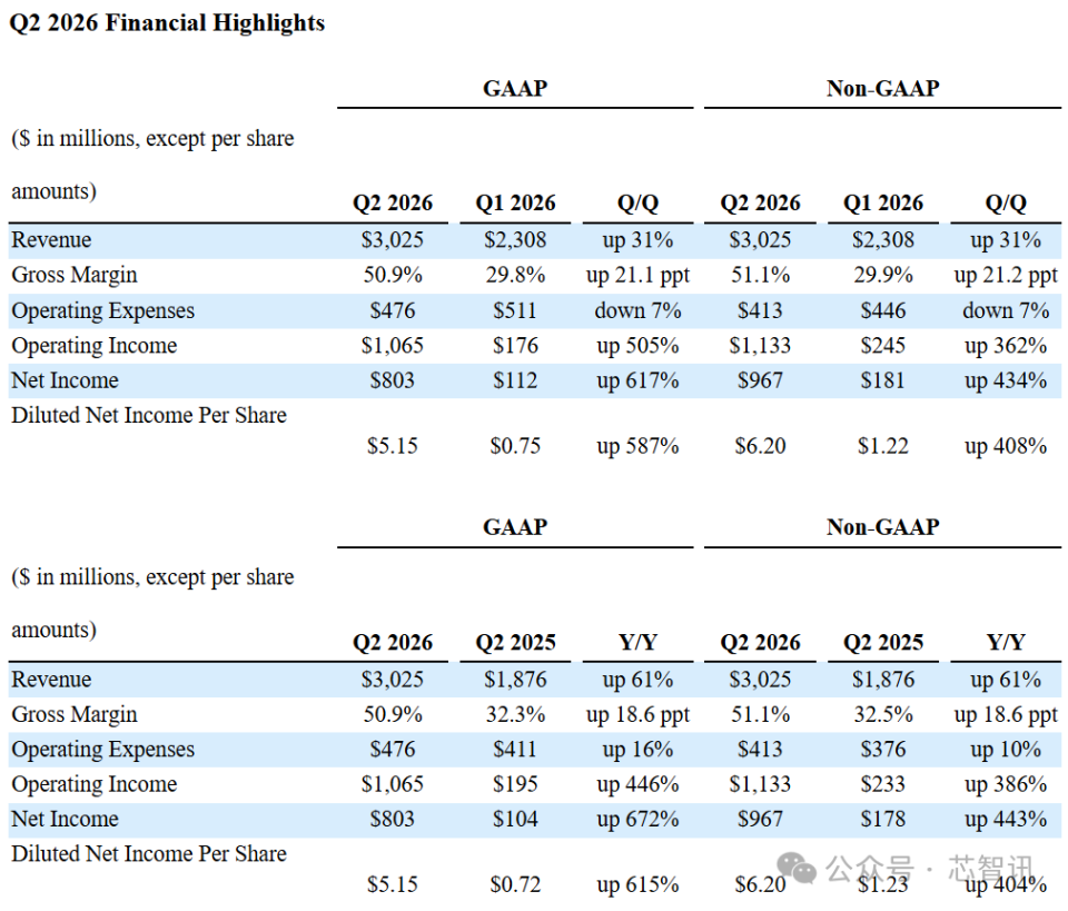 GAAP口径下:净利润8.03亿美元,同比暴涨672%,环比暴涨617%;每股收益5.15美元,同比暴涨615%,环比暴涨587%;毛利率为50.9%,同比增长18.6个百分点,环比增长21.1个百分点。
