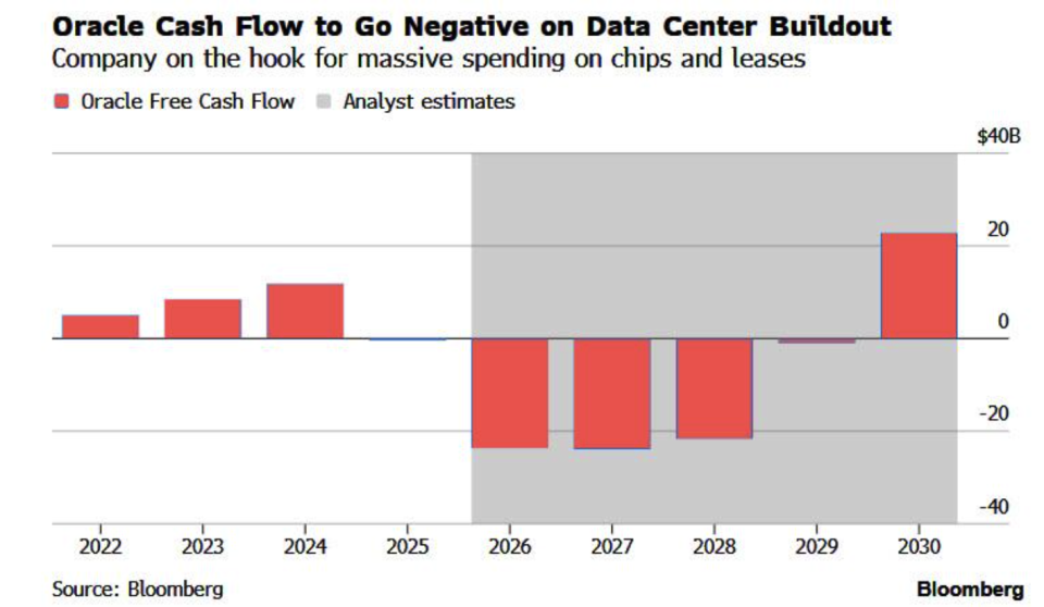 甲骨文建设AI数据中心对资金的需求速度远超其现金流入速度,公司自由现金流已转为负值,预计这一状况将持续至2030年。