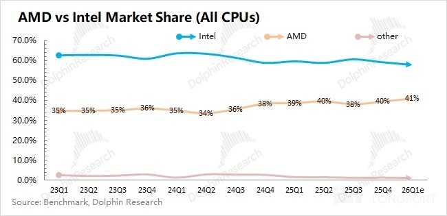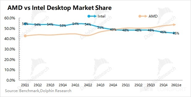 b)CPU 竞争力提升:AMD 持续在侵蚀英特尔在 CPU 领域的份额。