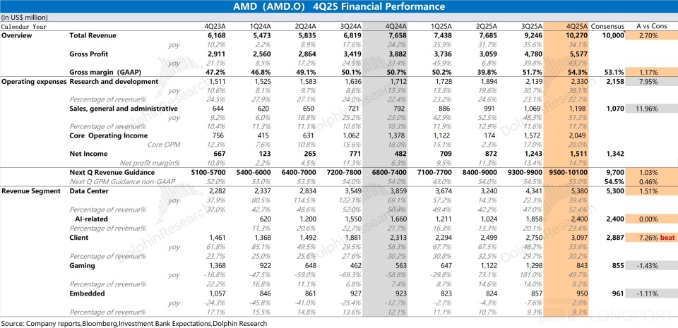 1、整体业绩:AMD 在 2025 年第四季度实现营收 102.7 亿美元,同比增长 34.1%,好于上调后的市场预期(100 亿美元)。在近期服务器 CPU 回暖的带动下,市场主流机构已经对公司的预期进行上调。本季度收入端的增长,也主要得益于数据中心 CPU、客户端业务的带动。
