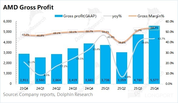 AMD 在 2025 年第四季度实现毛利 55.8 亿美元,同比增加 44%。其中本季度的毛利率为 54.3%,出现明显回升。