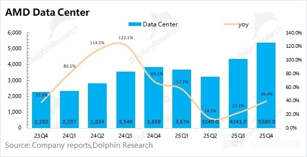 AMD 的数据中心业务在 2025 年第四季度实现收入 53.8 亿美元,同比增长 39%,达到市场上调后的预期(53 亿美元左右)本季度的同比增长,主要服务器CPU 出货增长和 MI308 的再次销售。