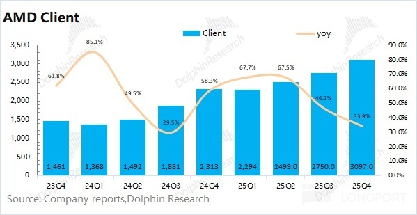 AMD 的客户端业务在 2025 年第四季度实现收入 31 亿美元,同比增长 34%,好于市场预期(29 亿美元)。客户端业务的增长,主要得益于 PC 市场回暖以及对英特尔份额的侵蚀。