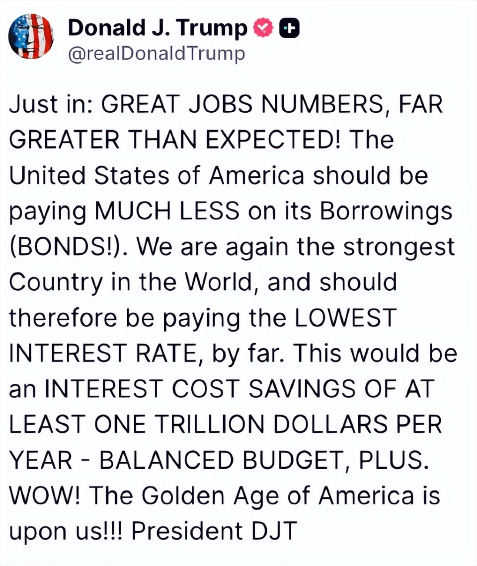 因为经济数据太好了,所以美联储要尽快降低利率缓解美国财政部的压力,这是美国就业数据和经济数据公布之后,特朗普杀死经济学的逆天发言。