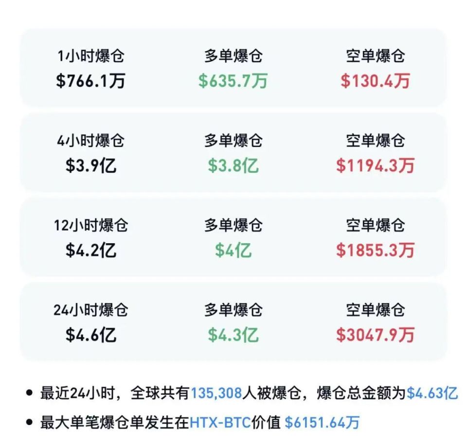 Coinglass数据显示,最近24小时内,加密货币市场超13万人被爆仓,爆仓总金额为4.63亿美元。其中,多单爆仓金额为4.3亿美元,空单爆仓金额为3047.9万美元。