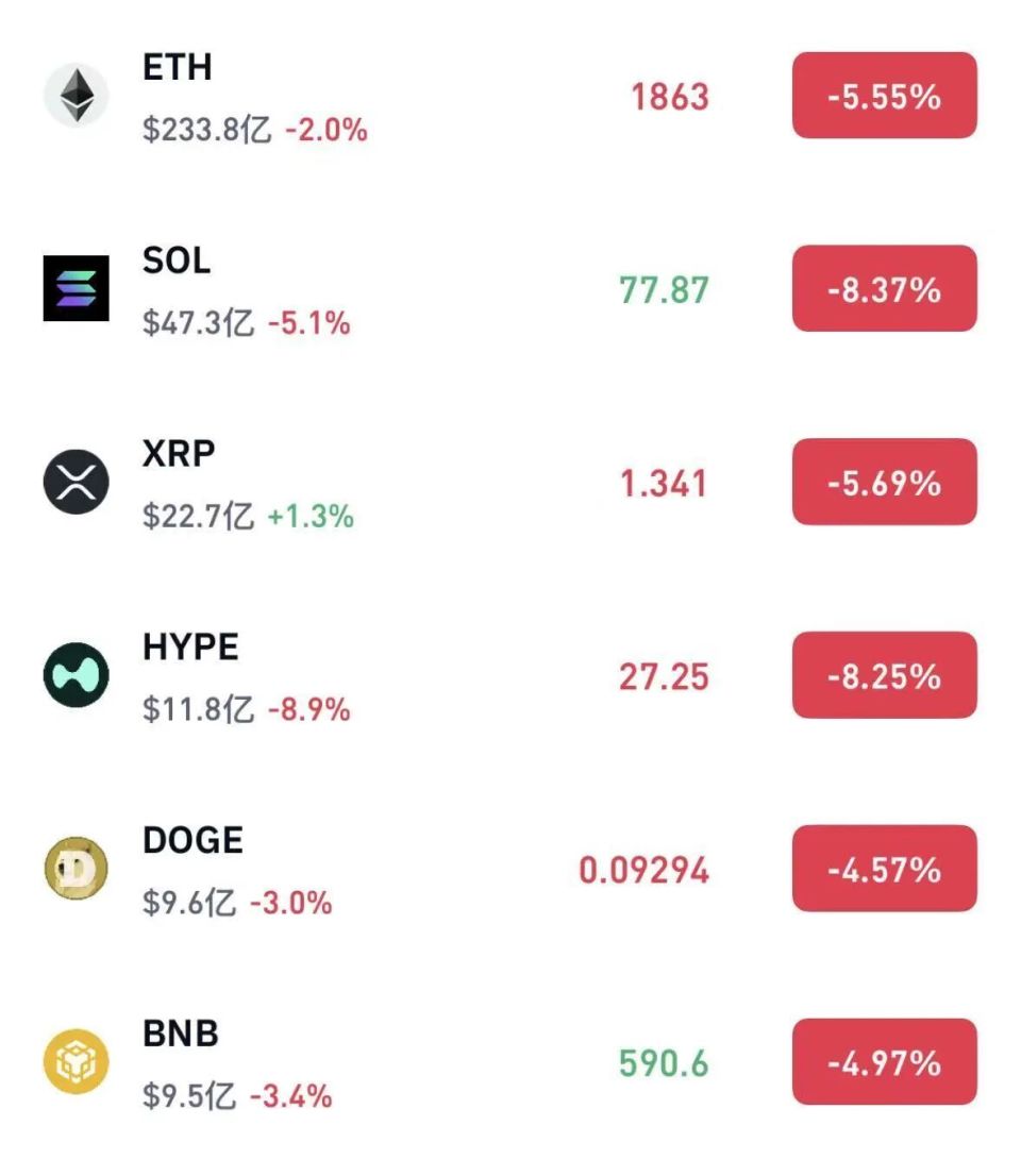加密货币市场整体呈现下跌态势,多只产品跌超5%。