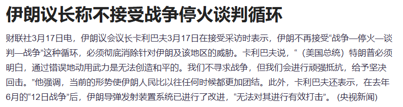 伊朗议会议长卡利巴夫3月17日在接受采访时表示,伊朗不再接受“战争—停火—谈判—战争”这种循环,必须彻底消除针对伊朗及该地区的威胁。伊朗外长阿拉格齐3月16日在德黑兰举行的新闻发布会上表示,伊朗对霍尔木兹海峡的封锁只针对“敌人”,针对“那些对我国发动不公正侵略的国家及其盟友”。