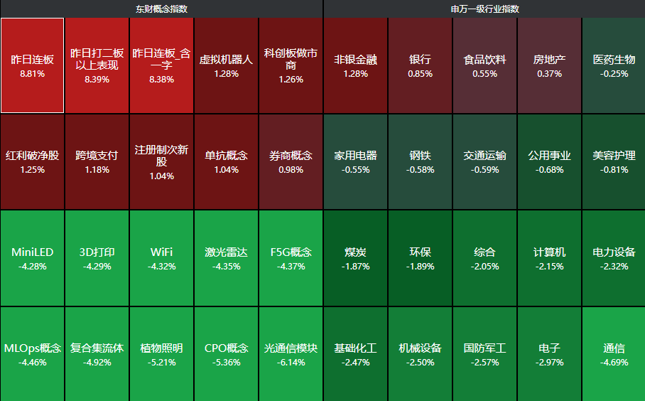 分行业来看,仅非银金融、银行、食品饮料、房地产四大行业领涨,通信、电子、国防军工、机械设备、基础化工等行业领跌。