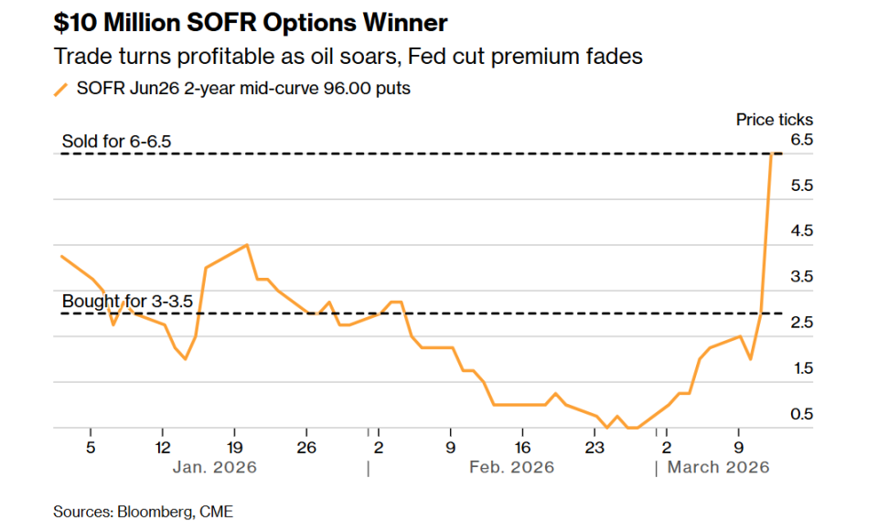 一笔挂钩担保隔夜融资利率的期权交易斩获1000万美元,交易在1月提前布局,押注美联储长期维持高利率,借油价暴涨与降息预期逆转成功获利了结。
