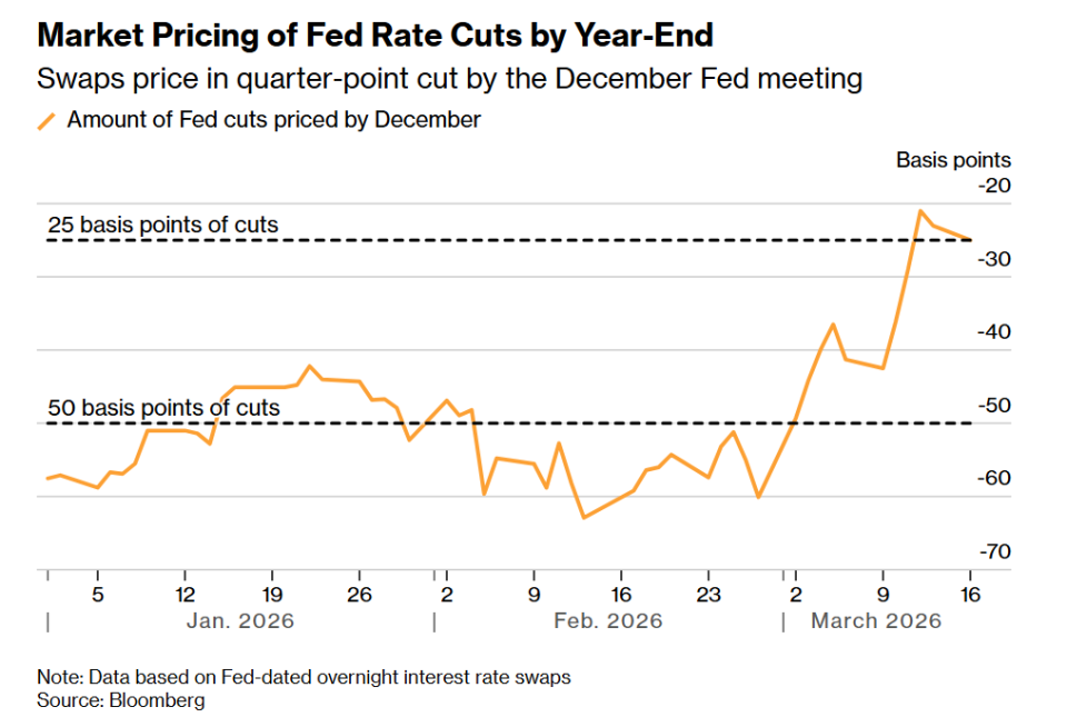 目前,交易员预计美联储到今年年底仅会降息约25个基点,远低于2月底市场计价的至少两次降息。他们还上调了更远期的利率预期:2028年6月到期的SOFR期货利率较3月初高出约30个基点。