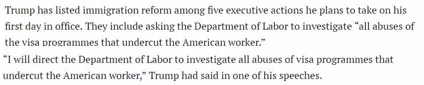 据报道,川普在他上任后的第一件事情即是着手开展五项移民方面的政策改革,其中有一项就是要求劳工部调查“所有因滥用签证而导致美国人失业的情况。”