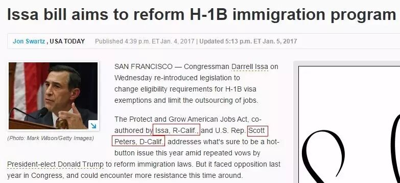 这项法案由共和党议员Darrell Issa 和民主党议员Scott Peters 共同提议。Scott Peters在一份声明中强调:“遏制H1B签证的滥用将保证美国人就业的机会,并且确保这些签证能让真正需要它们的公司得到,以此来留住能为该公司创造效益的人才们。”