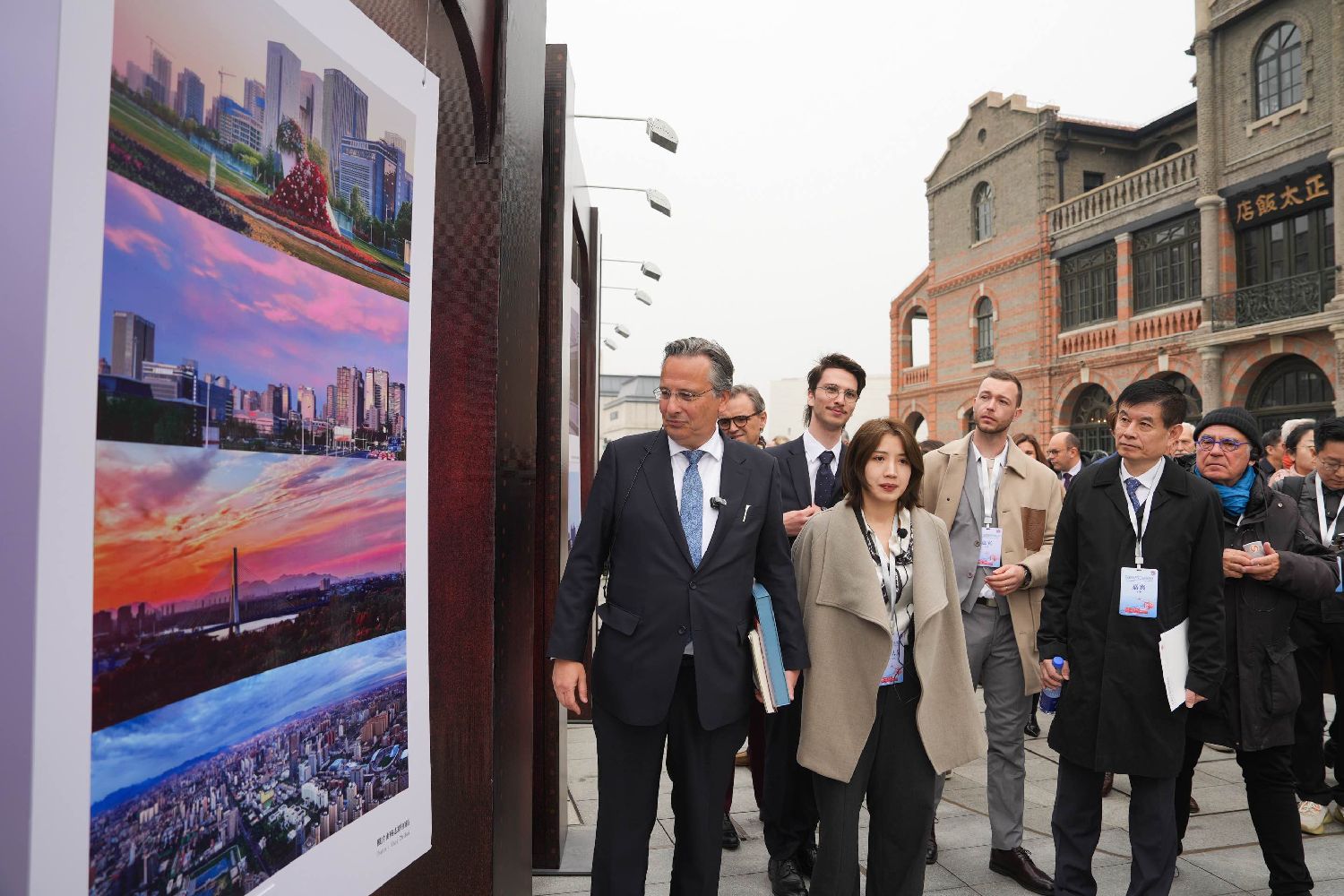 10月22日,石家庄法国日系列活动在河北石家庄开幕,中外嘉宾在正太广场参观“百年正太光影交融”正太铁路图片摄影展。(图片来源:中新社)