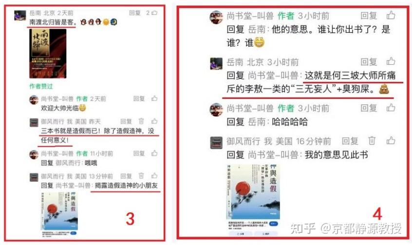 我在给这个造假造神陈粉大师和找爹造神DNA程序的典型代表岳大师留言后,继续留言说他那三本《南渡北归》就是造假产品,除了造神造假,没有任何意义!岳大师终于再次跳出来辱骂我是“何三坡大师所痛斥的李敖一类的三无妄人加臭狗屎。”我立刻出示我的《造神与造假》一书加以还击。发言见如下截图:
