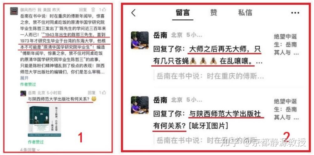 网络上对这个造假造神陈粉大师和找爹造神DNA程序的典型代表岳南的介绍,到处可见“中国作家富豪榜上榜作家”这几个字!再看他的照片,脖子都没了,大头大脸硬栽在肩膀上的感觉!好一副“我是富豪我怕谁”的架势。我其实找他很久了。但是因为作家朋友们知道我要对他兴师问罪,所以都告诉我联系不上他。如今,在这个“尚书堂叫兽”的微信留言上遇到了他的真身,我就立刻发布了他声称傅斯年当面告诉陈哲三的那段话,刚才我说了:1943年出生的陈哲三先生,直到1973年才研究生毕业于台湾的东海大学,他根本不可能是“原清华国学研究院毕业生”!我质问陕西师范大学出版社的编辑们是怎么审稿的?!于是,岳大师终于脸上挂不住了,他问我:“与陕西师范大学出版社有何关系?”我的答复居然被博主删除了。我的答复是:“因为该出版社责任编辑居然无法发现你的书出现很多重大的史实错误。也不认真核对!”愤怒的岳大师先答复我说:“大师之后再无大师,只有几只苍蝇在乱嚷嚷。”见如下发言截图: